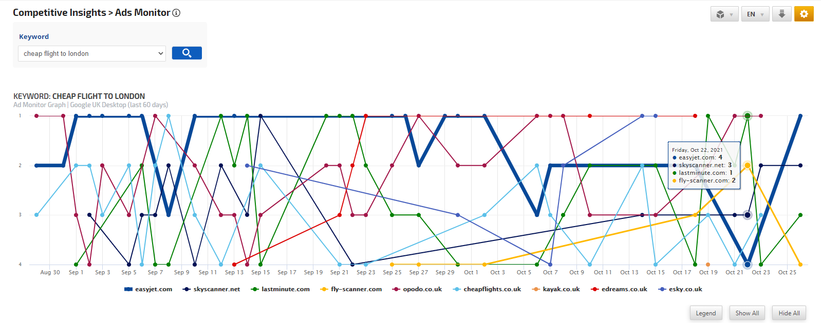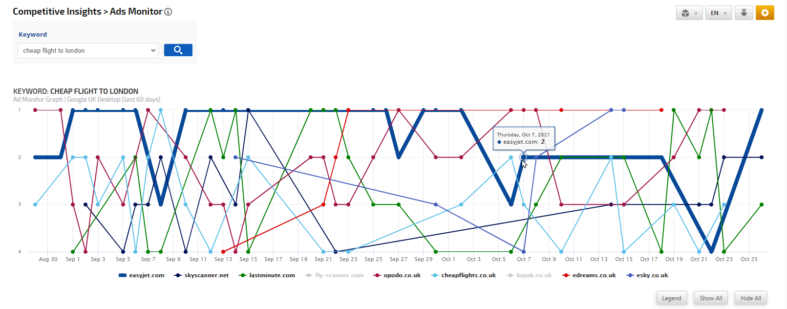 This graph displays the top advertisers, along with their ad positions, competing for 1 keyword over a 60 day period.
