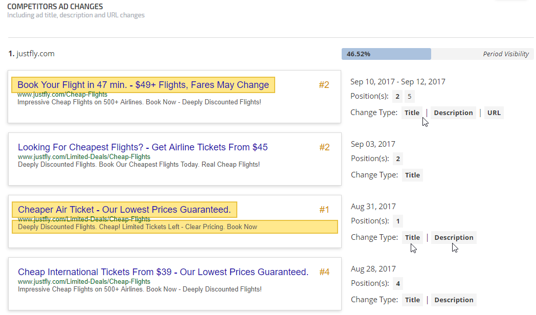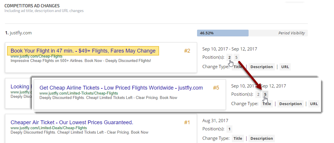 The Competitor Ad Changes report is interactive and provides options for the discovery of the title, link, description, and multiple ad placement positions for the site advertised for the tracked keyword. In this example, the keyword has ranked in positions 2 and 5 for different target landing pages and with different ad copy.