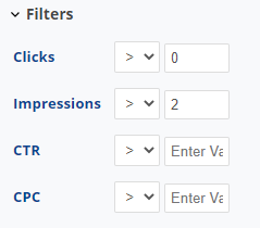 • Available filters are Clicks, Impressions, CPC and CTR with the operator >/ = / < where the value of the metric has to be specified  in order for the report data to be filtered.