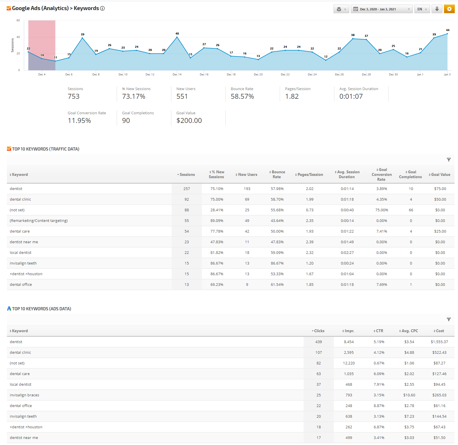 Important! To view this report ,Google Analytics must be configured correctly (please refer to our Google Analytics documentation) for the primary domain. In addition, AdWords must be linked to your Google Analytics (see Google's instructions to Link Google Analytics and AdWords).