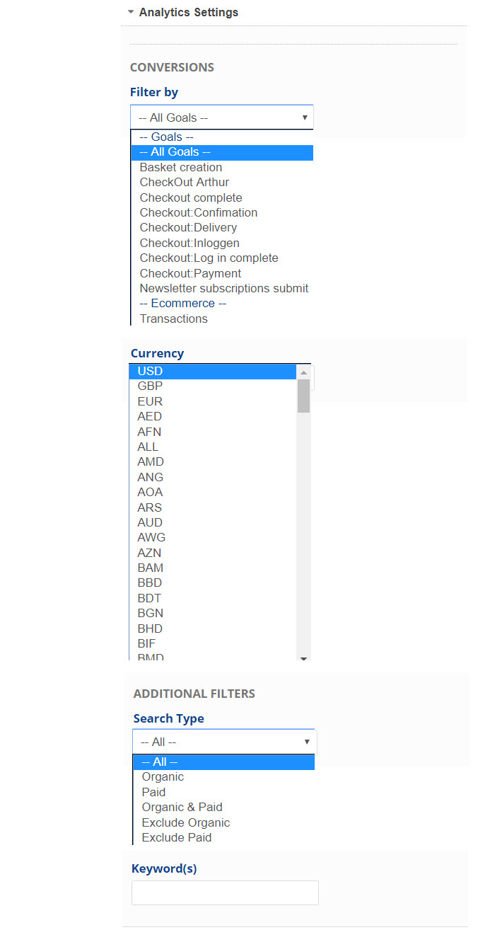 • Select from the list of world currencies the one you've set in your Google Analytics account for this domain.  If the currency you have set up in Google doesn't pass correctly through Google Analytics to Rank Ranger, you can change the currency symbol with this setting.