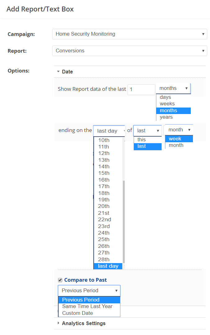 To change the number of weeks or months displayed in a specific report, click the gear icon for any marketing dashboard report element and expand the Date option section, enter the number and click the Save Button.