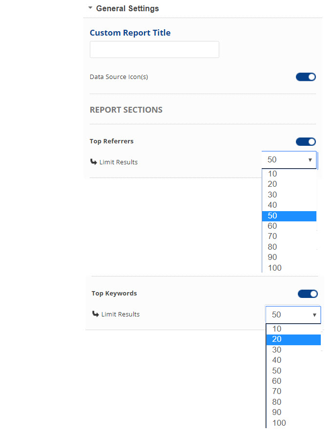 • Display or hide the Data Source Icon (i.e., Google Analytics icon displays next to each section heading