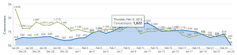 Use the "Compare to Past" option to analyze conversion between two time periods, mouse-over any point or number for detailed description.