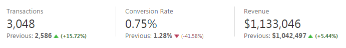 In the section below the graph you'll see the number of Conversions and Conversion Rate or when Ecommerce is selected in the Goals/Conversions section of Report Options the Transactions, Conversion Rate and Revenue are displayed. You can also view the change from a previous time period by selecting 'Compare to Past' with a date range in Report Options.