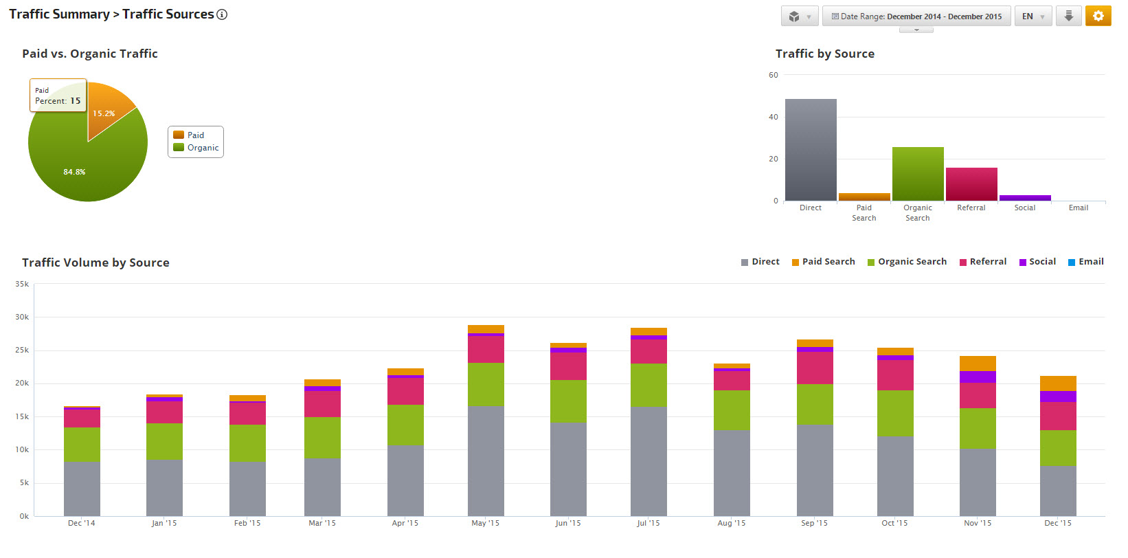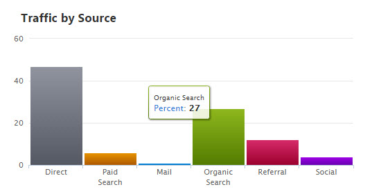The bar graph shows the total percentage of traffic from each source: Direct, Paid Search, Mail, Organic Search, Referral and Social.