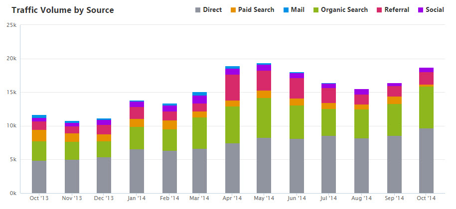 This chart shows the traffic from various sources, by month.