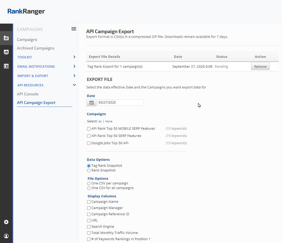 Use this tool to easily export rank data by Tag Groups from multiple campaigns in your account.