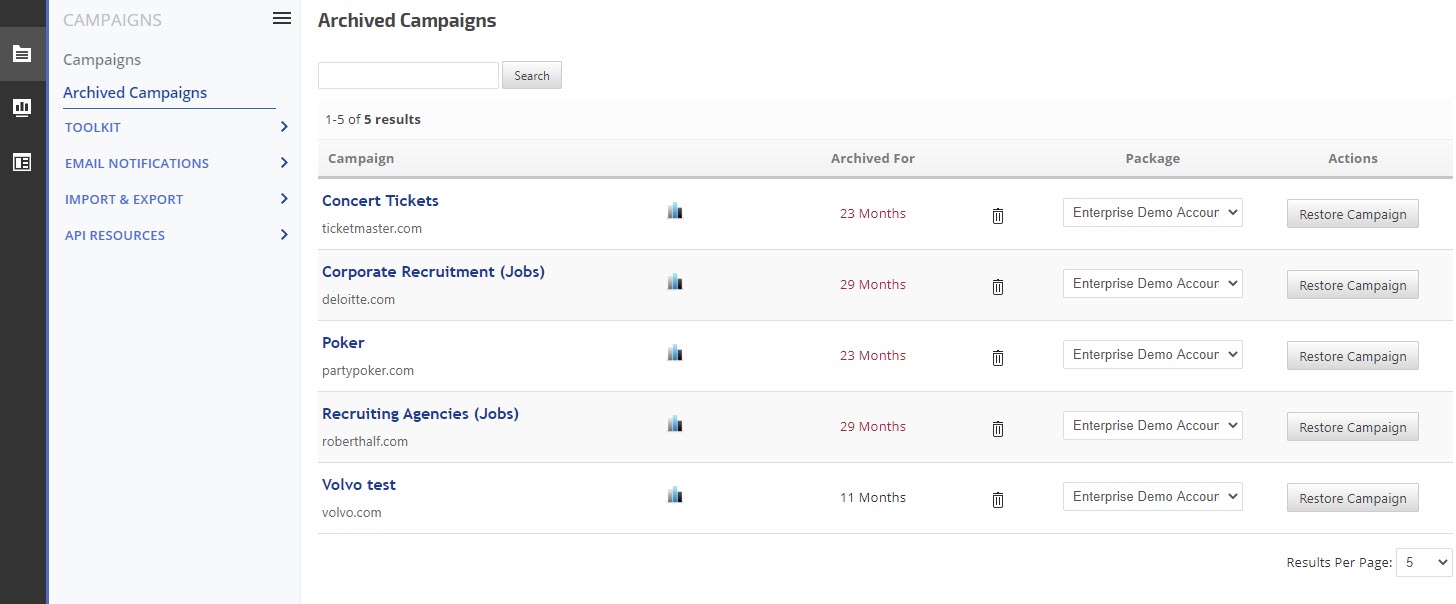 To permanently delete a campaign that has been stored in Archived Campaigns, click the Delete (trash can) button. Once deleted, campaigns cannot be restored.