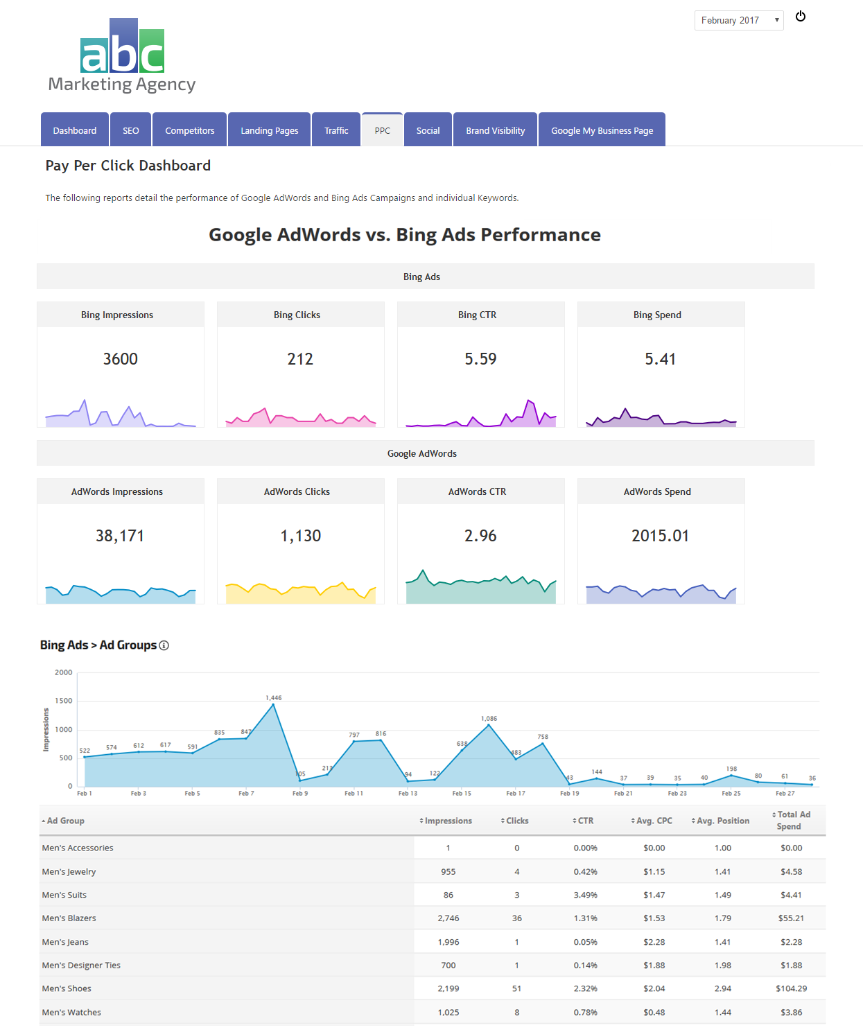 Metric Widgets comparing PPC metrics from Bing Ads and Google AdWords campaigns, followed by the Bing Ad Groups Performance graph trending impressions, and a table displaying all available metrics (you may choose to highlight specific metrics and hide others).