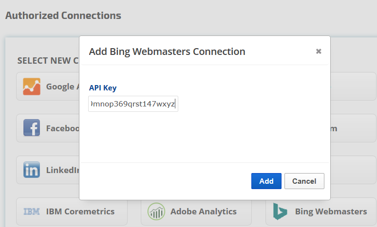 - If the screen displays with no options for selecting a Bing Webmaster account, then you need to follow the Authorize Bing Webmaster Tools instructions above for adding a connection to your account.