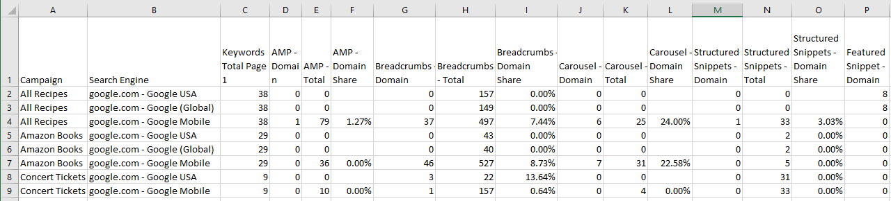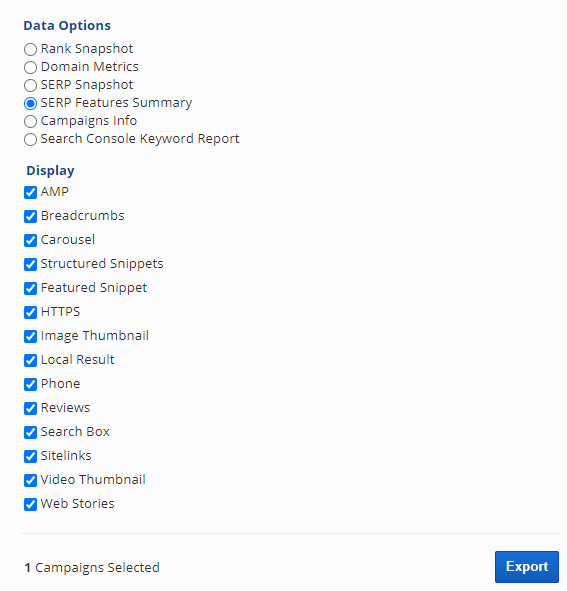 Use our Campaign Export tool to easily export a SERP Features Summary in CSV format. Export data for one or multiple campaigns in one CSV in a compressed ZIP file.