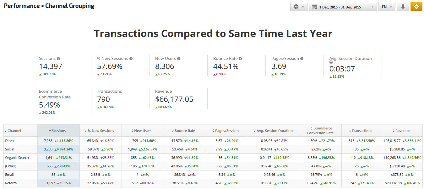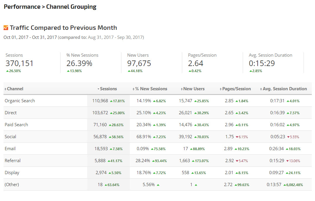 The Analytics Channel Grouping report provides insights into traffic acquisition, user engagement with the site, goal conversions and e-commerce transactions including number and rate of conversions as well as revenue.