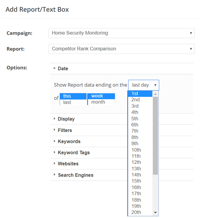 Search EnginesSelect the Search Engine(s) you want included in the report; If multiple Search Engines are selected, you have the option to change the display order by clicking the arrow next to the Search Engine and dragging it into the desired order. |