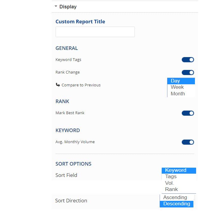Rank data can be filtered by keywords, keyword tags, and search volume. Custom sort options allow for sort by any of the report columns in ascending or descending order.