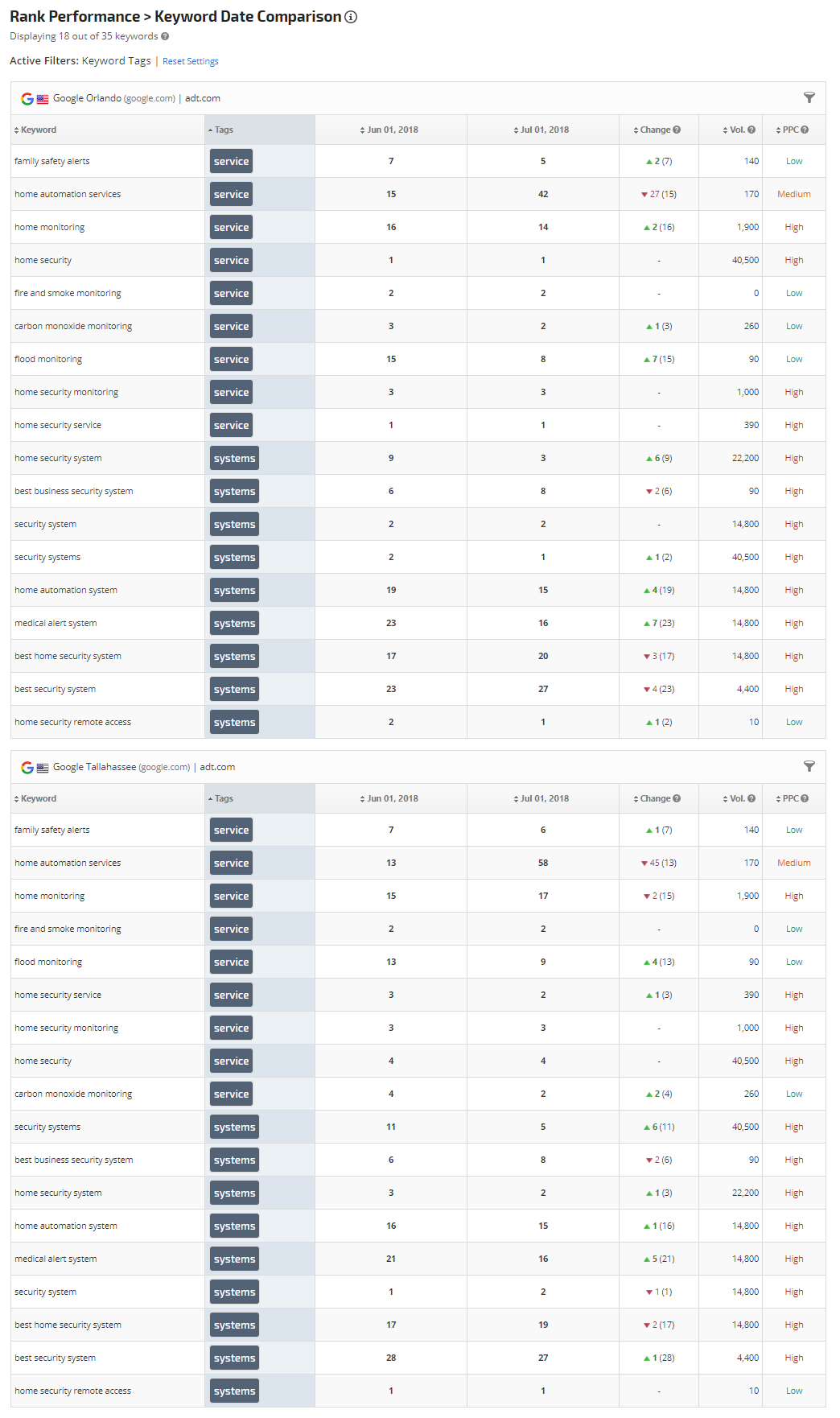 Use the SEO Monitor to conduct an in-depth analysis of the top 20 SERP competitors for each campaign keyword and search engine. The SERP Change report provides a daily SERP snapshot with title and description, landing page(s),