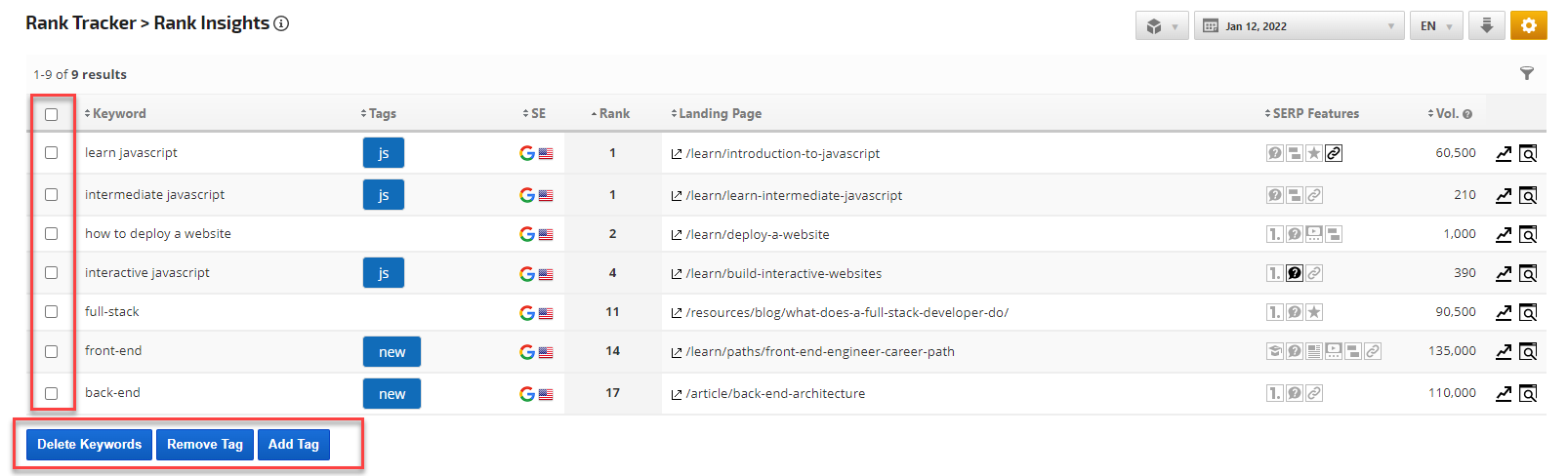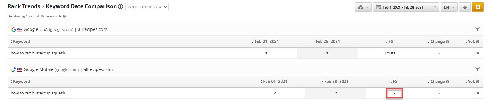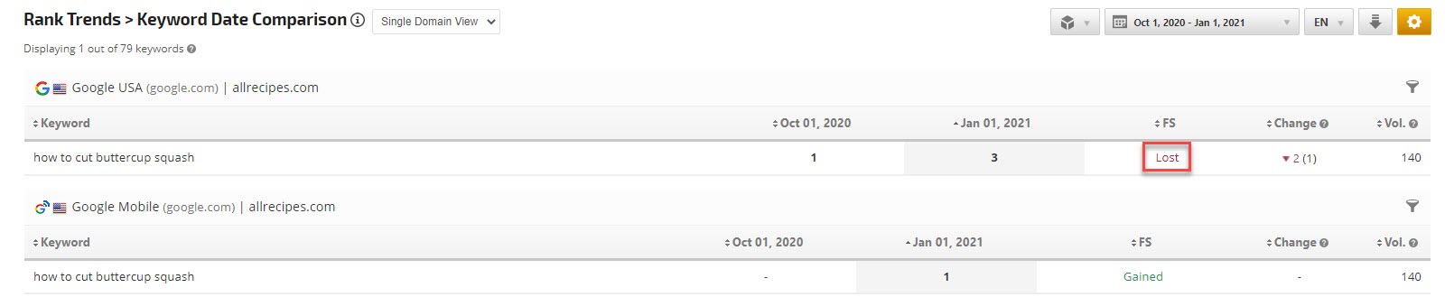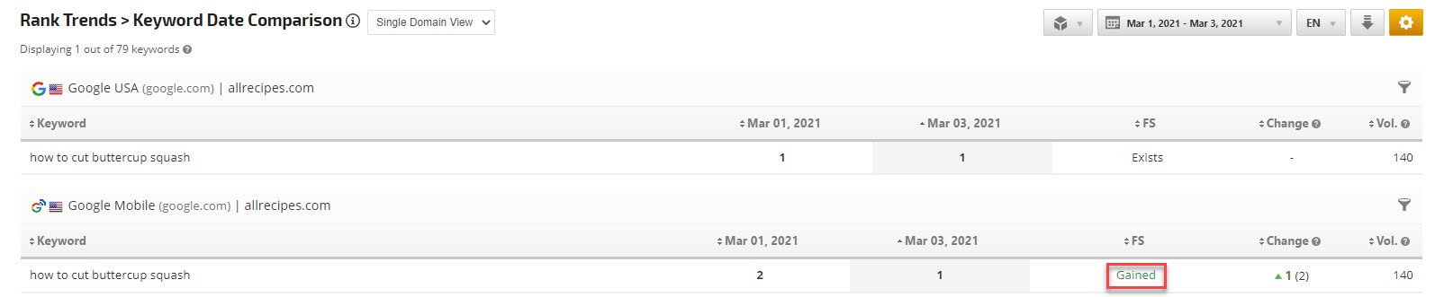 - Change Type: the type of change that occurred in the SERP between the rank date and the previous rank date. Clicking on a change type highlights the change.