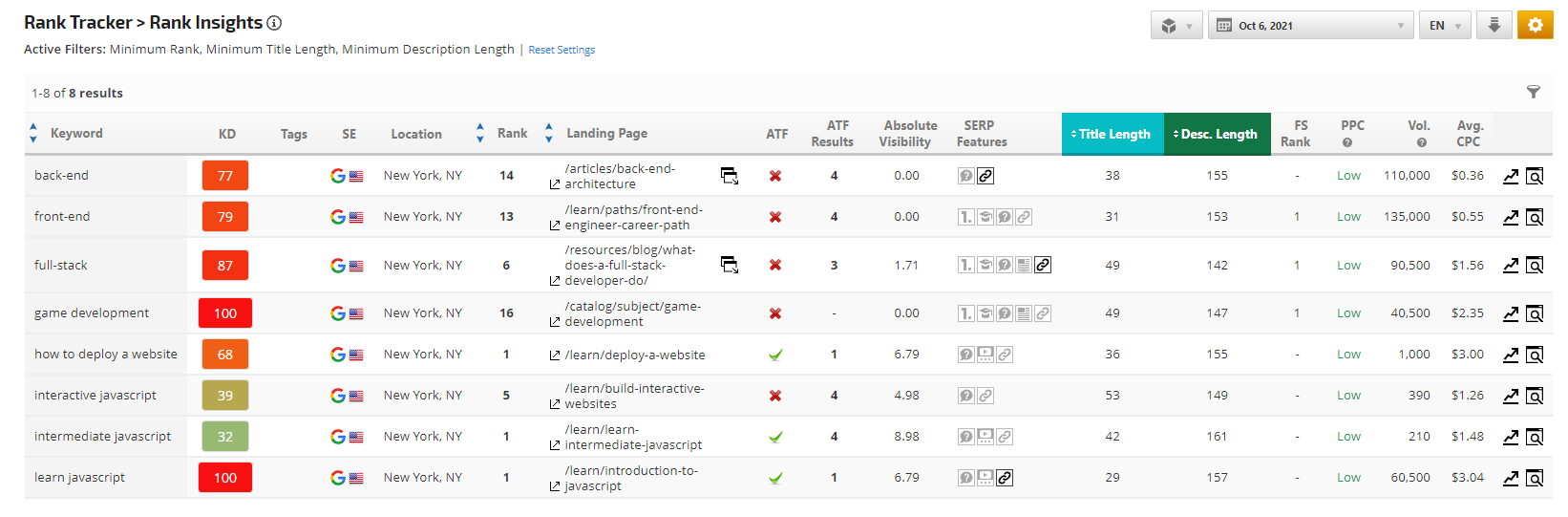 SERP indicators, and rank positions for the selected keyword for up to 20 competitors.