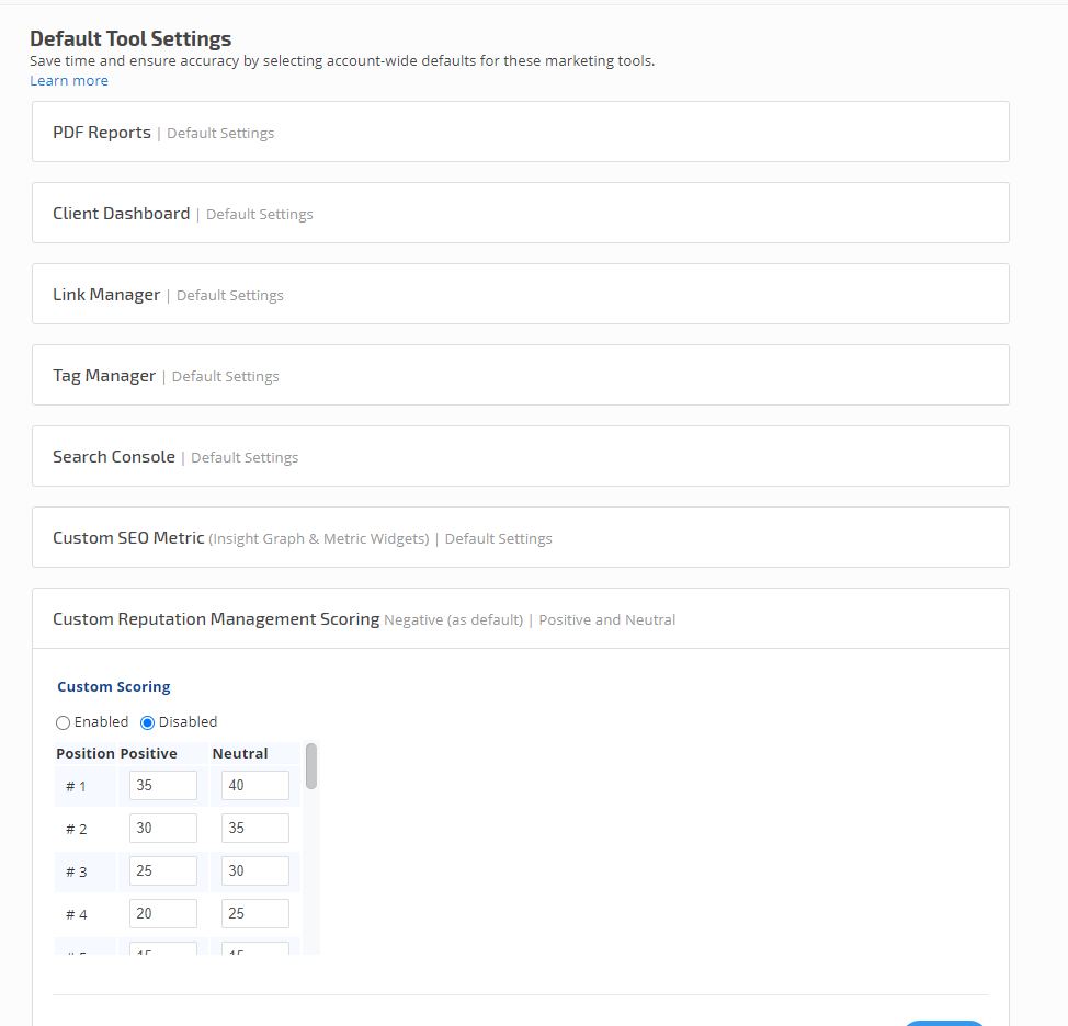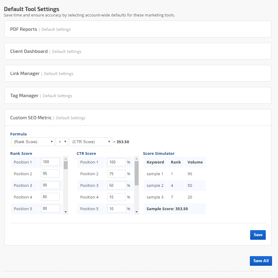 - In the Rank Score section enter the numbers you want to be attributed to each of the top 100 search engine result positions