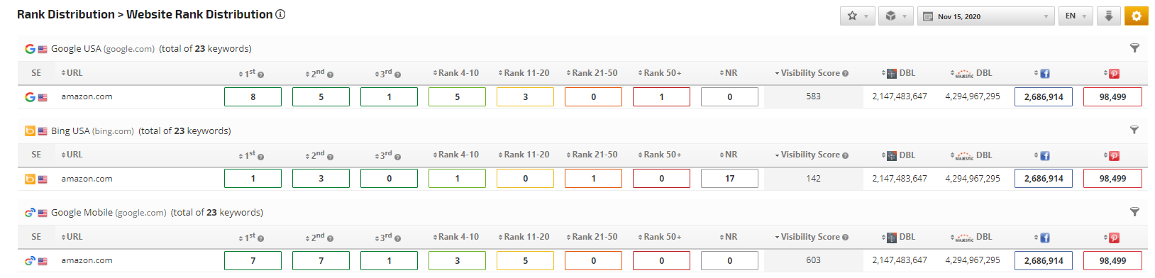 The Website Rank Distribution report displays the number of keywords ranking in 1st, 2nd and 3rd and up to 50+ position in the SERPs. Additional domain metrics include a score representing the overall strength of the domain, visibility score, Majestic and Ahrefs backlink data, and social signals for the primary domain and tracked competitor sites.