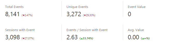 This section demonstrates the total number of events that occurred during the report period and provides metrics such as the number of unique events, value (if a value exists in Analytics for an event), and sessions involving events.