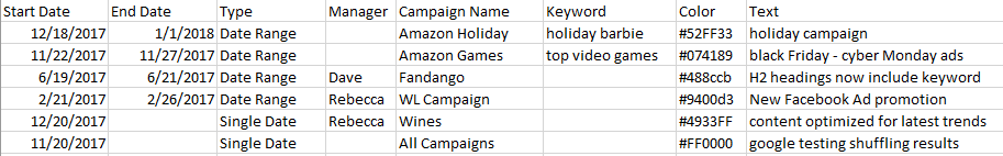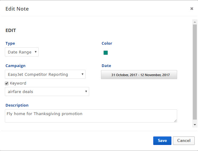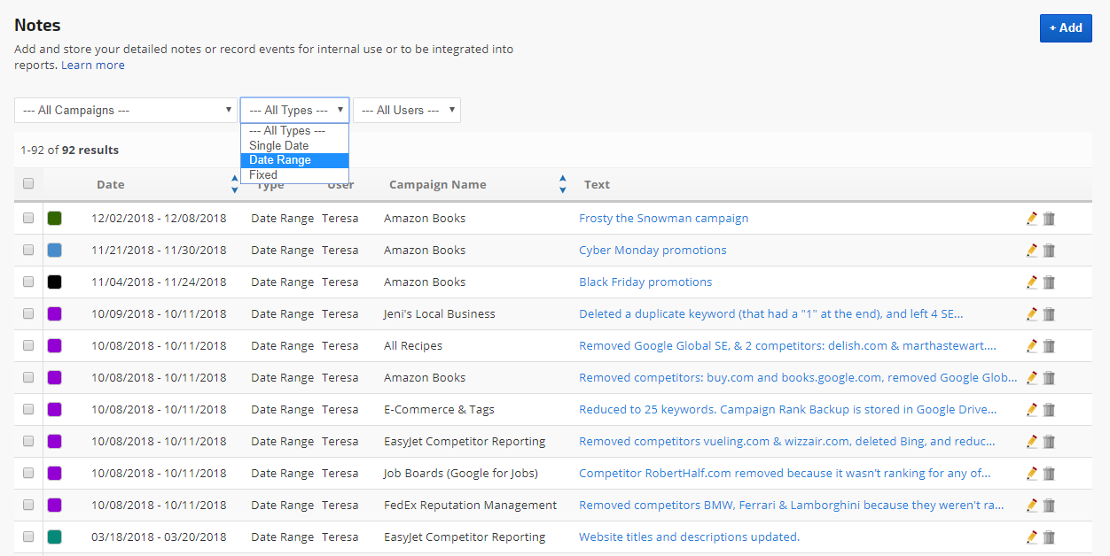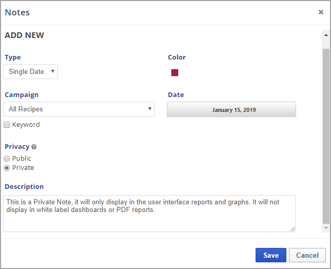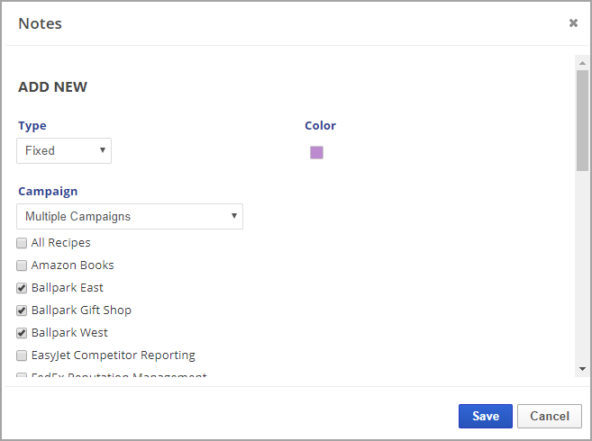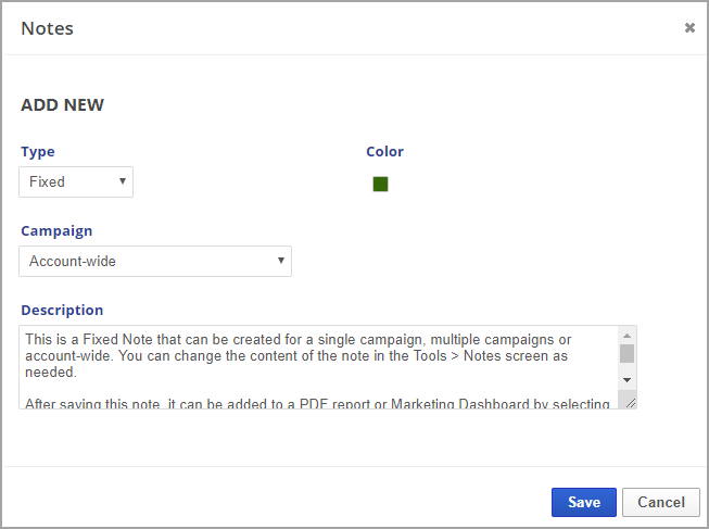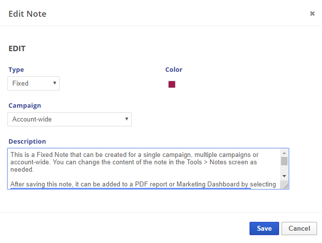 - Fixed can be used to display a message for a single campaign, specific multiple campaigns or account-wide continuously. This note type is not limited to specific date(s), it can be set to display in white label marketing dashboards, client dashboards and PDF reports, and then the content can be changed as needed, in the Campaigns > Toolkit > Notes screen.