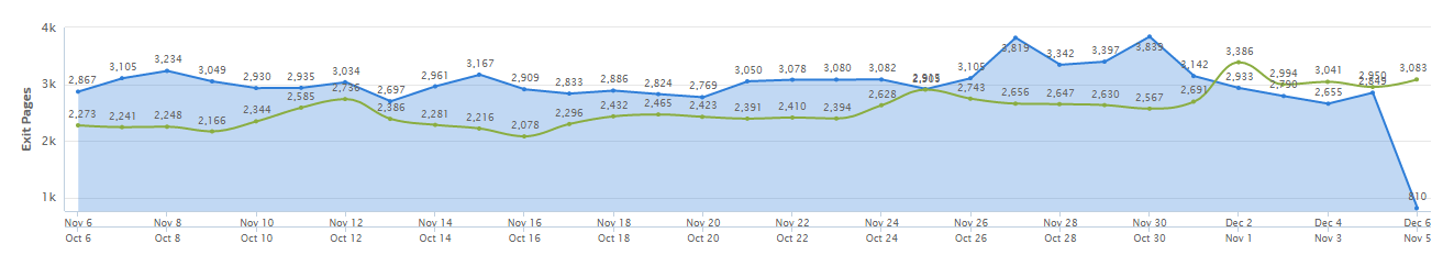 The Traffic Graph can be set to the key metric of Exit Pages or Sessions, and you can compare the current period to a previous period.