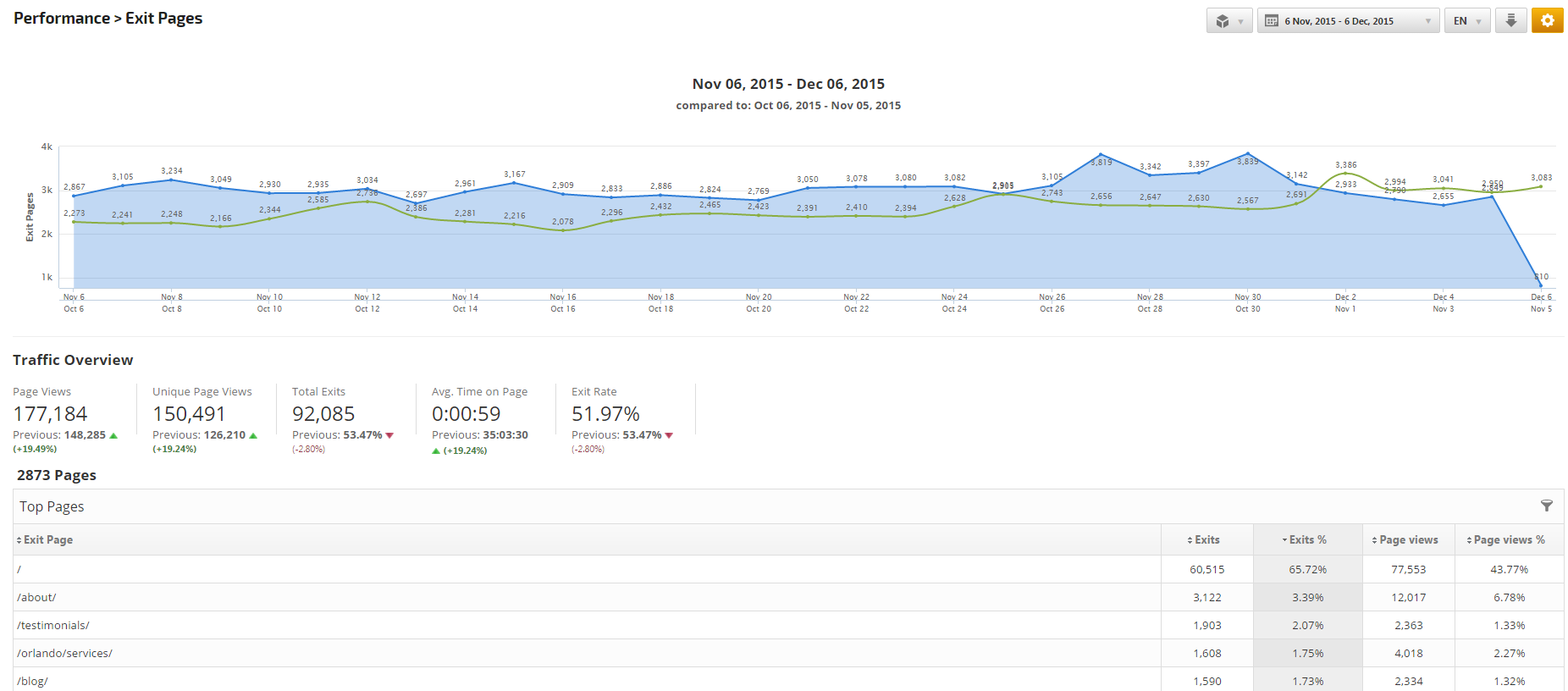 The Analytics Exit Pages report provides page performance in an interactive comparative traffic exit page or session graph. Discover trends in the number of Page Views, Unique Page Views, Average Time a visitor spends on a page, Total number of Exits and the Exit Rate, plus view a list of the Exit Pages with individual statistics for each page.