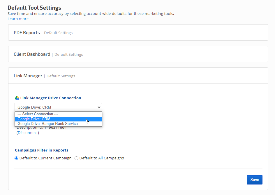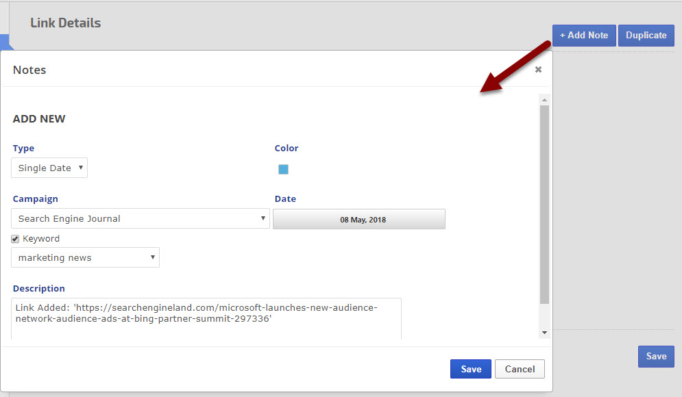 Clicking the + Add Note button launches a Notes detail screen with the Description automatically containing the basic information for that link. You may select for the note to display for a single date or date range, choose a color, select a campaign and even a specific keyword to apply the note to.