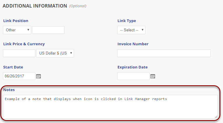 To create a note for display in a Link Manager reports, enter text in the Additional Information > Notes field and Save.