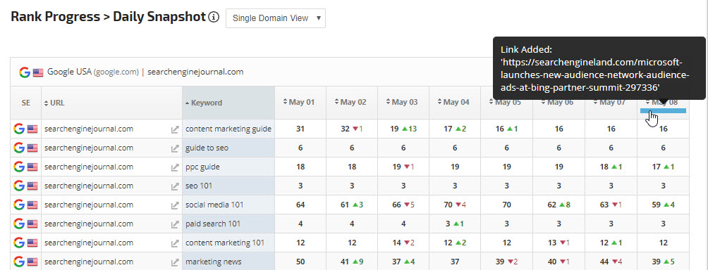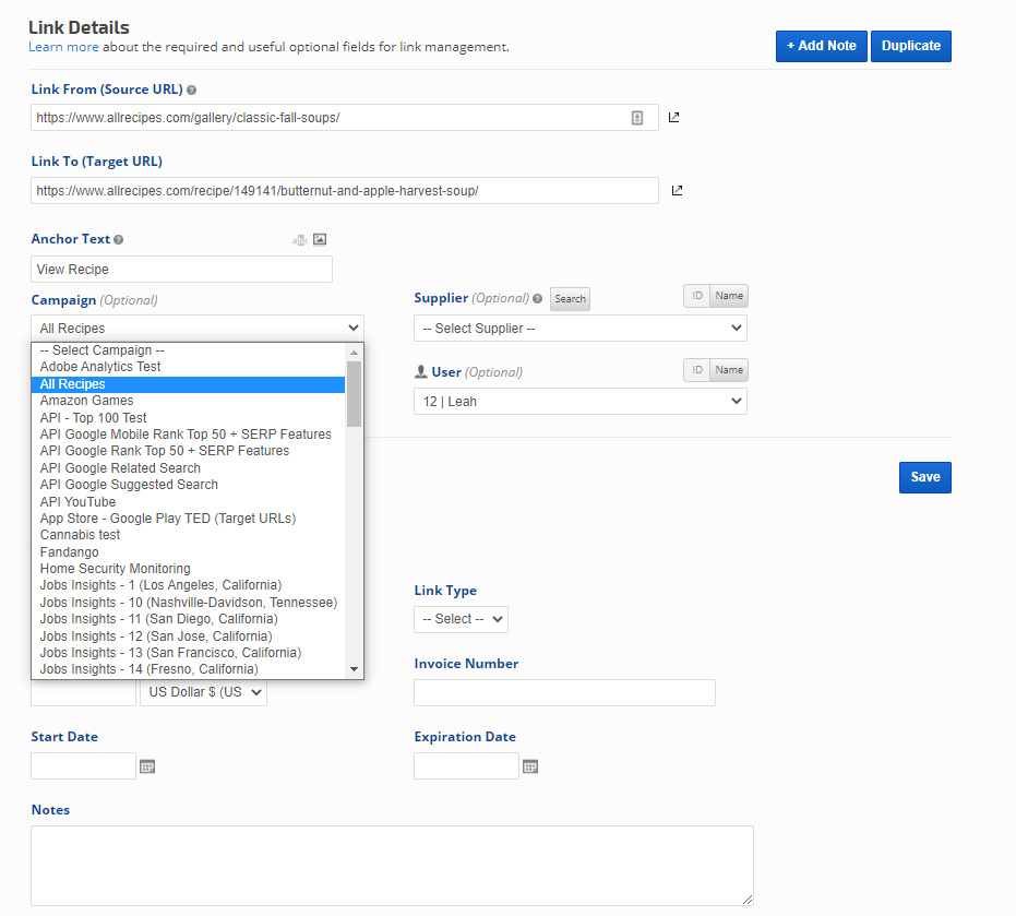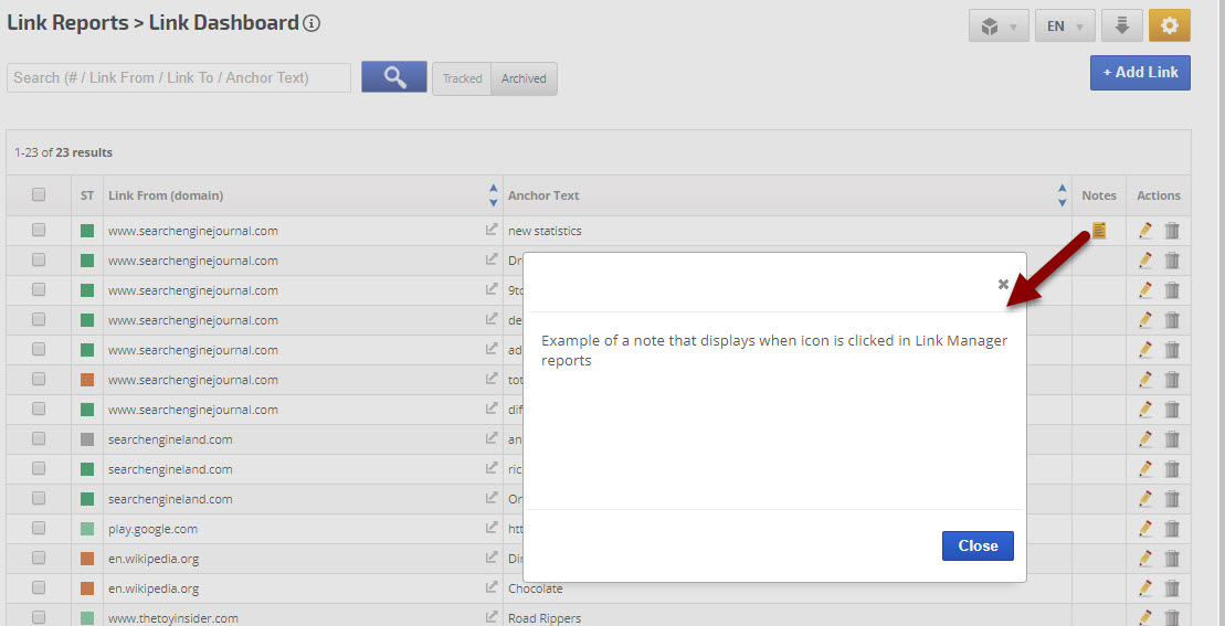 You can add notes directly from the Link Details screen, associate the note with a rank tracking campaign and even an individual keyword.