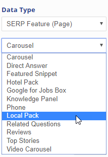 SERP Feature (Page) provides the number of times a specific SERP Feature (e.g., Carousel, Direct Answer, Featured Snippet, Hotel Pack, Google for Jobs Box, Knowledge Panel, Phone, Local Pack, Related Questions, Reviews, Top Stories or Video Carousel) displayed in Google results for a page on the domain(s) selected in the Custom View settings (for the campaign(s), keyword(s) and search engine(s) selected).