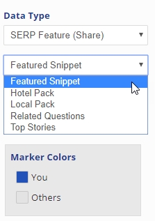 SERP Feature (Share) provides the number of times a specific SERP Feature (e.g., featured snippet, hotel pack, local pack, related questions or top stories) displayed in Google results based on the Custom View settings for the tracked domain vs. competitors.