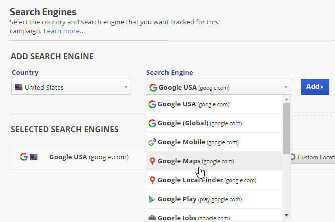 • Custom Location Settings: the search engine country has already been selected, you can target the location further by entering a state, city or postal code in any of these formats: