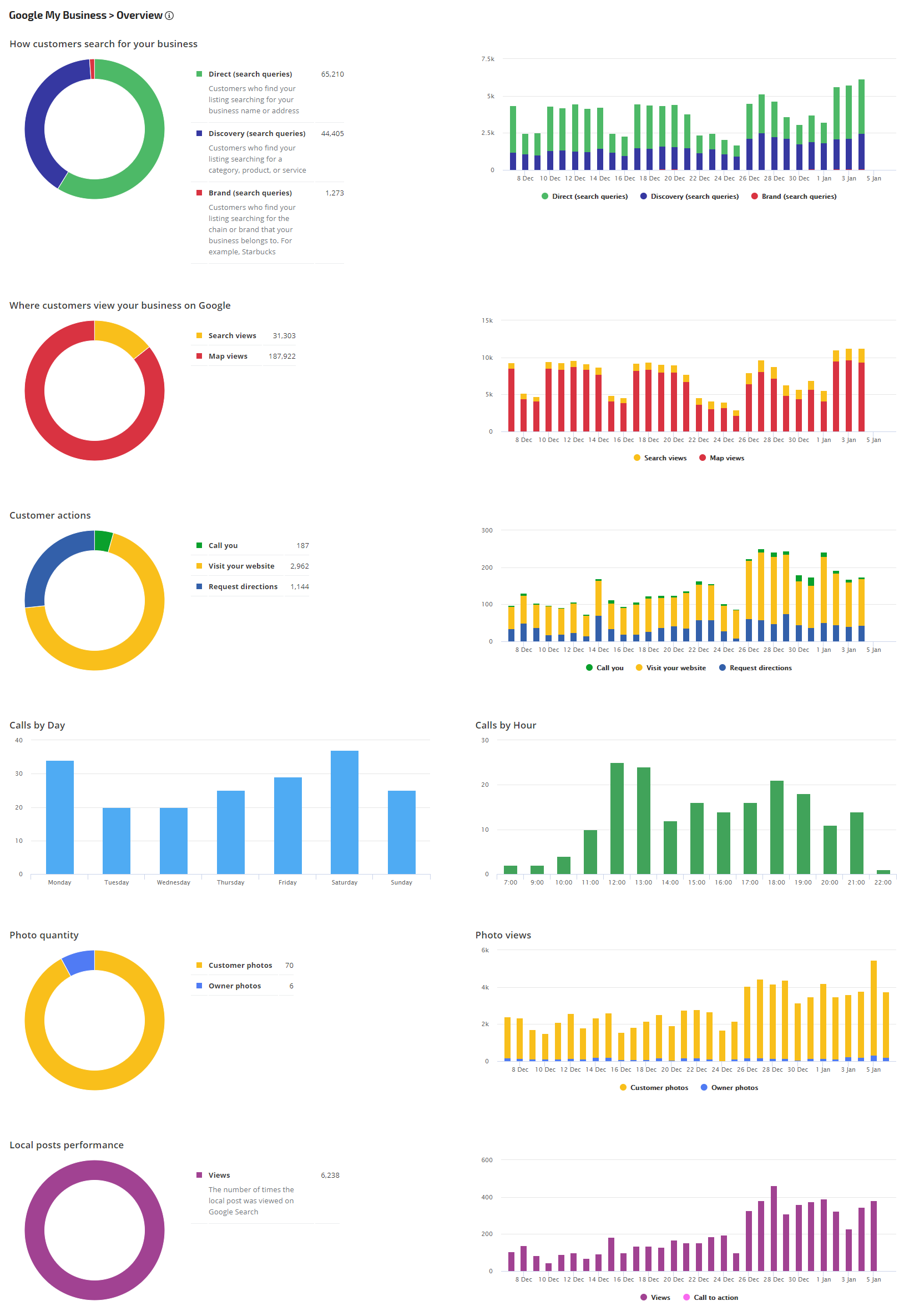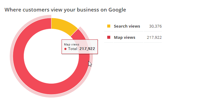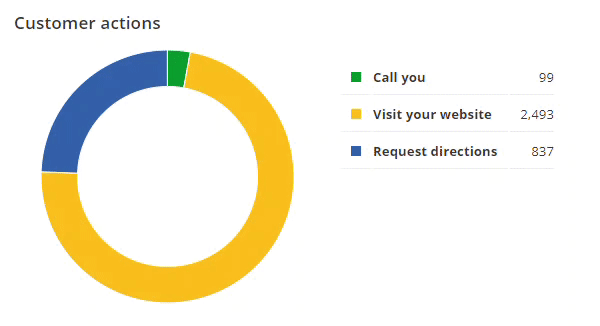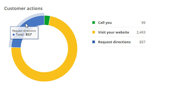 Hover over a chart section to review the number of customer actions: calls to the business, website visits, and requests for directions to the business location.