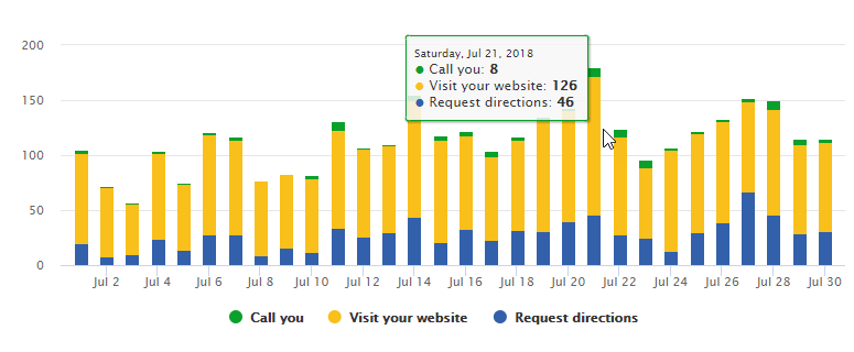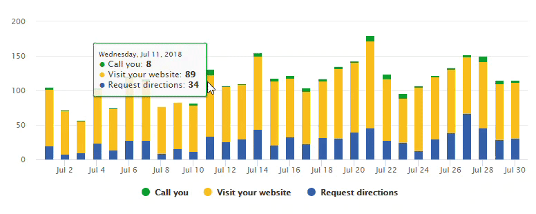 Hover over a bar for a specific date to view the number of requests for directions to the business, phone calls, and clicks through to the website associated with the Google My Business listing.