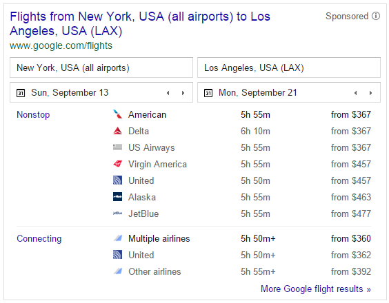 Answer Box: Flight Search with Type, Airline, Duration, and Prices