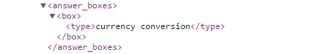 If an answer box of the currency type exists for the keyword search results page, the API indicates the existence and labels the type as "currency conversion".