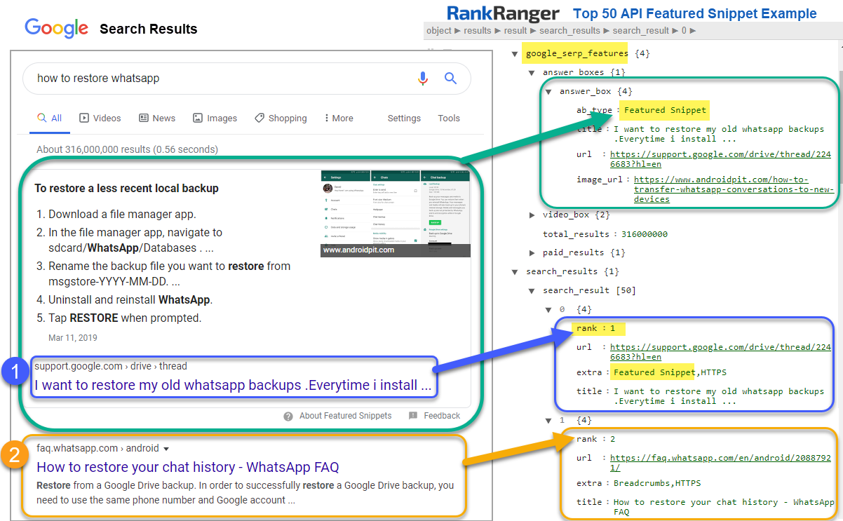 • For APIs that have Google SERP Features included, Featured Snippets are identified in the google_serp_features > answer boxes > answer_boxab_type: Featured Snippet. Included in that result is the title, url and image_url when they exist in the Featured Snippet.