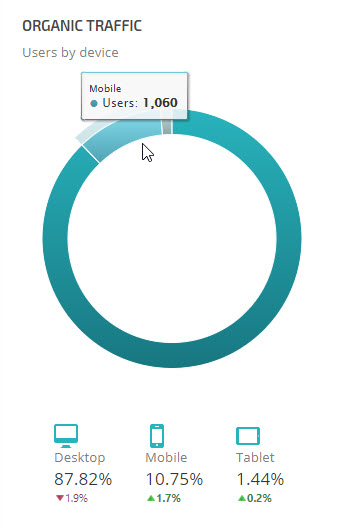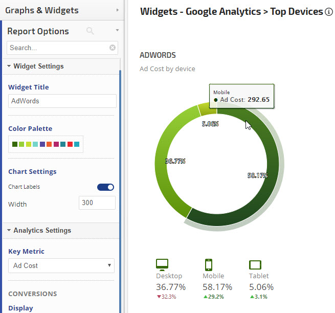 The Google Analytics Top Devices widget is a colorful graphic presentation a site's traffic from desktop, mobile and tablet based on key metrics from the website's Google Analytics account, including integration with AdWords campaigns. Data can be filtered by a variety of traffic metrics, dimensions, conversions, segments and events.
