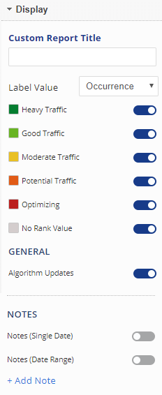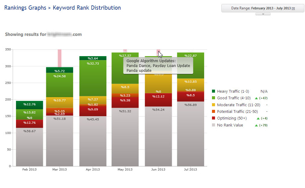 The Monthly Keyword Rank Distribution graph provides an analysis that visually demonstrates results of strong SEO efforts and/or lack thereof. You can run it for full month total rank data or select a specific snapshot day. Additional filters allow you to show or hide any of the keyword rank position options.