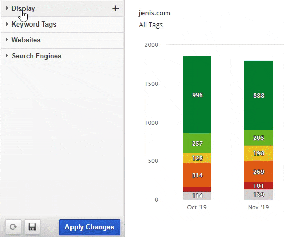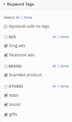 The default settings include all keywords in the campaign, but you can also filter the report for a specific keyword group (by using Tags), and for all or specific search engine(s) those keywords are being tracked on. Selecting more than one search engine combines the results for multiple search engines together. For example, if a keyword is ranked: