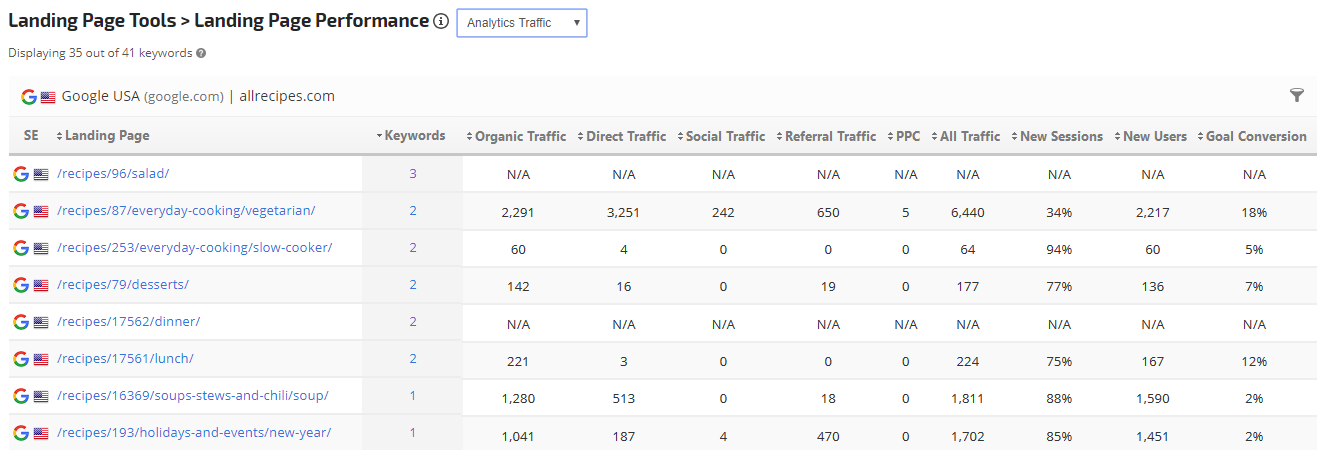 Once Google Analytics has been integrated with your Rank Ranger account, traffic data can be analyzed per landing page in this report to give a better understanding of the success of specific landing pages.