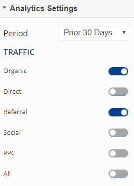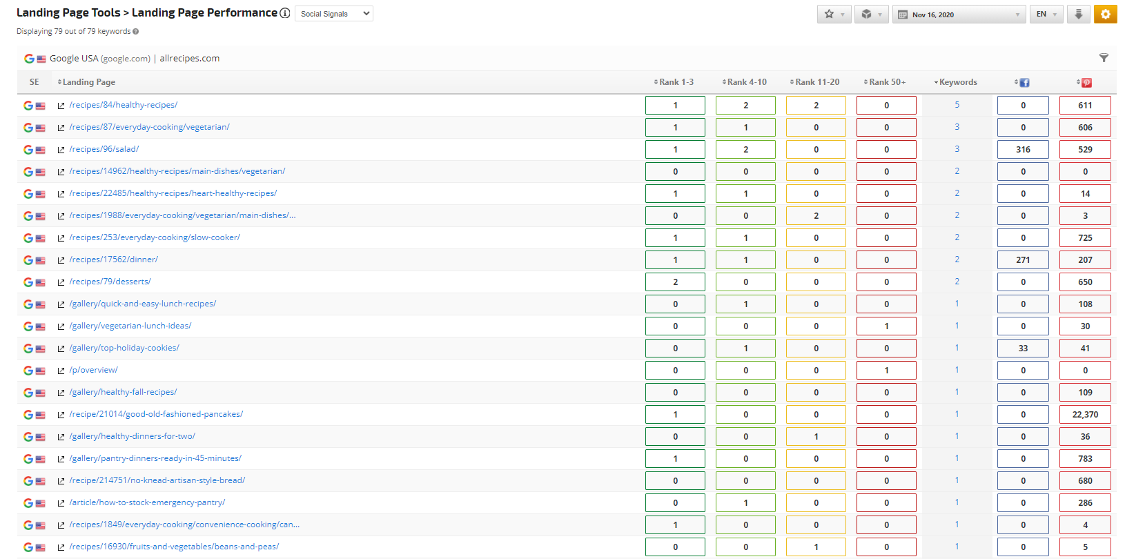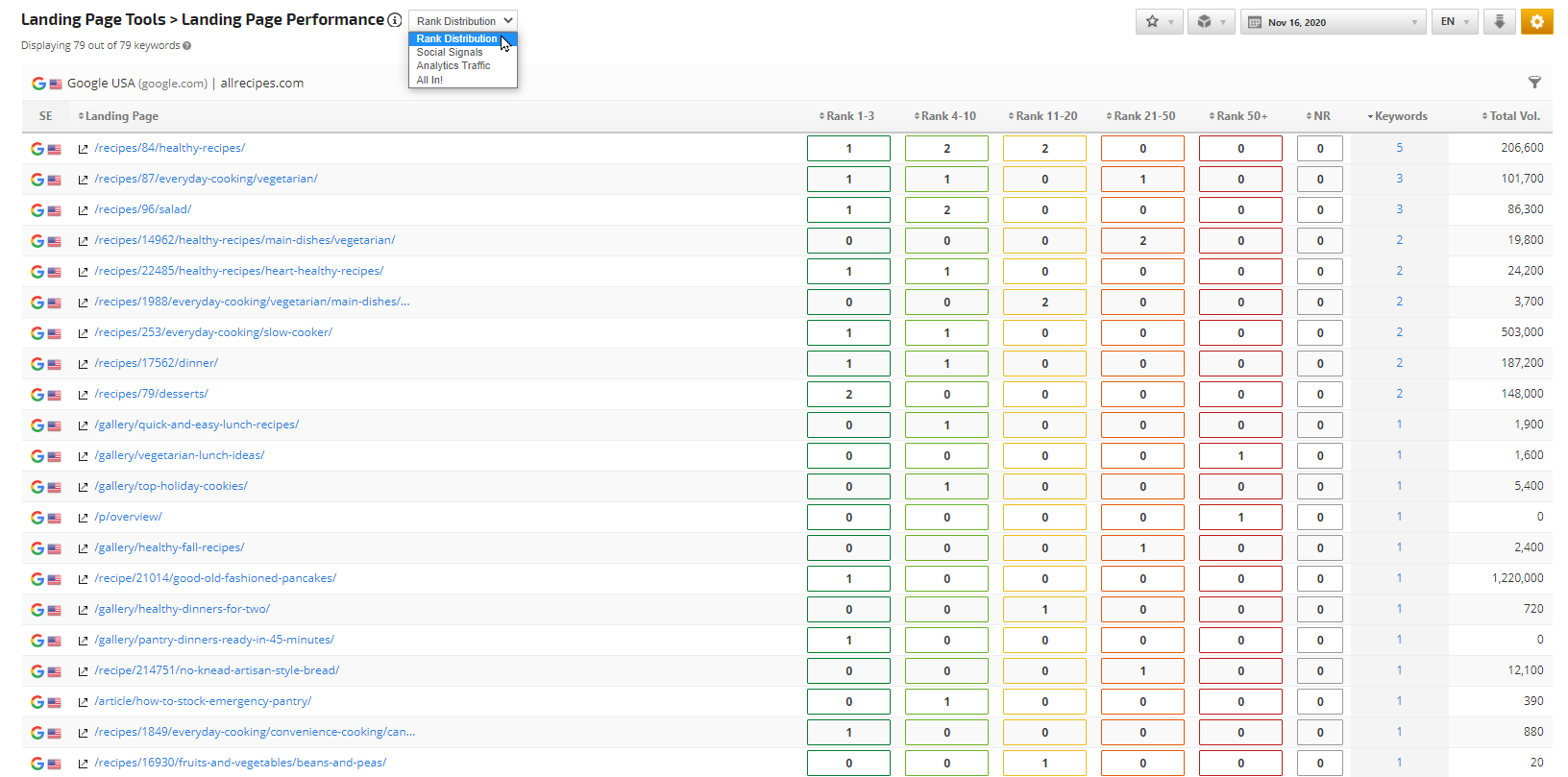 Keyword rank distribution, social signals, organic traffic and all traffic for specific landing pages are some of the options in our Landing Page Performance report. Filter and Sort selecting from a variety of parameters.
