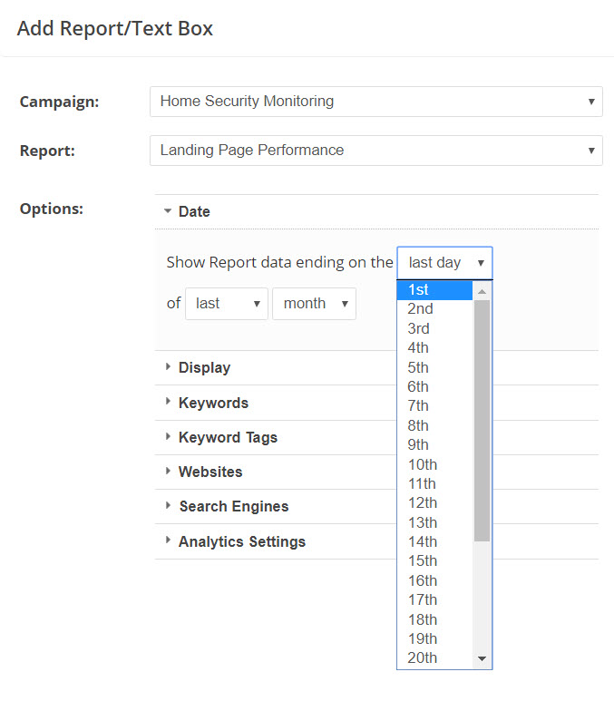 To change the number of weeks or months displayed in a specific report, click the gear icon for any marketing dashboard report element and expand the Date option section, enter the number and click the Save Button.