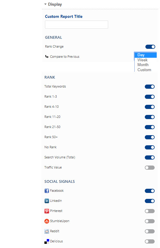 Set specific Social Signals in the Display section of Report Options to view the social impact of ranked landing pages on all available social media platforms.