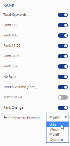 • Compare to Previous: if Rank Change is enabled, select the period to be compared to: previous day, week, month or custom dates.