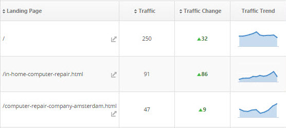 Google Analytics organic traffic, traffic change and a traffic trend graph provide insights into how specific landing pages are performing.