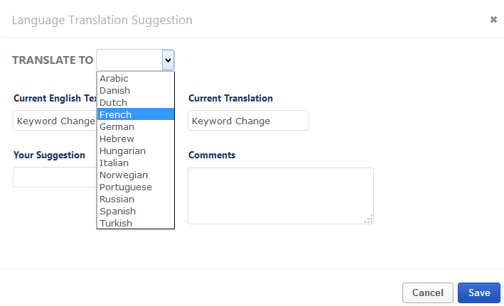 Suggestions can be made on-screen or by downloading and completing the translation spreadsheet for the desired language.