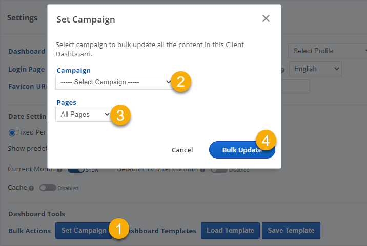 Set Campaign is an option that allows you to overwrite the setting of the reports of the current campaign with a different campaign. This is useful when loading a Dashboard Template or if pages were duplicated or were created using multiple campaigns and later decided that Dashboard should display another campaign's data. The Bulk > Set Campaign action could be performed on either an entire Marketing Dashboard or a page per campaign.